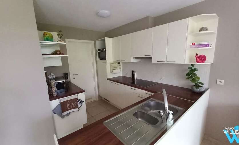 Zeer mooi en makkelijk bereikbaar appartement op de eerste verdieping van een verzorgd gebouw. Indeling : inkom, living met een open een volledig ingerichte keuken, wasruimte/berging, nachthall, toilet, badkamer met ligbad en dubbele lavabokast. Met een terras aan de voorzijde. Inclusief ondergrondse autostaanplaats. De lasten van het gebouw komen op extra € 100 per maand. EPC-waarde : 139, berekend energieverbruik (kWh/m²). Zeer zeker een aanrader.