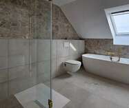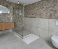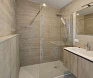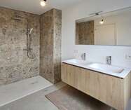 De leefruimte sluit mooi aan op de volledig uitgeruste keuken en straalt dankzij de gekozen materialen en afwerking een tijdloze klasse uit. De echte parketvloeren, de vloerverwarming en de kwalitatieve afwerking tillen het wooncomfort hier naar een hoger niveau.